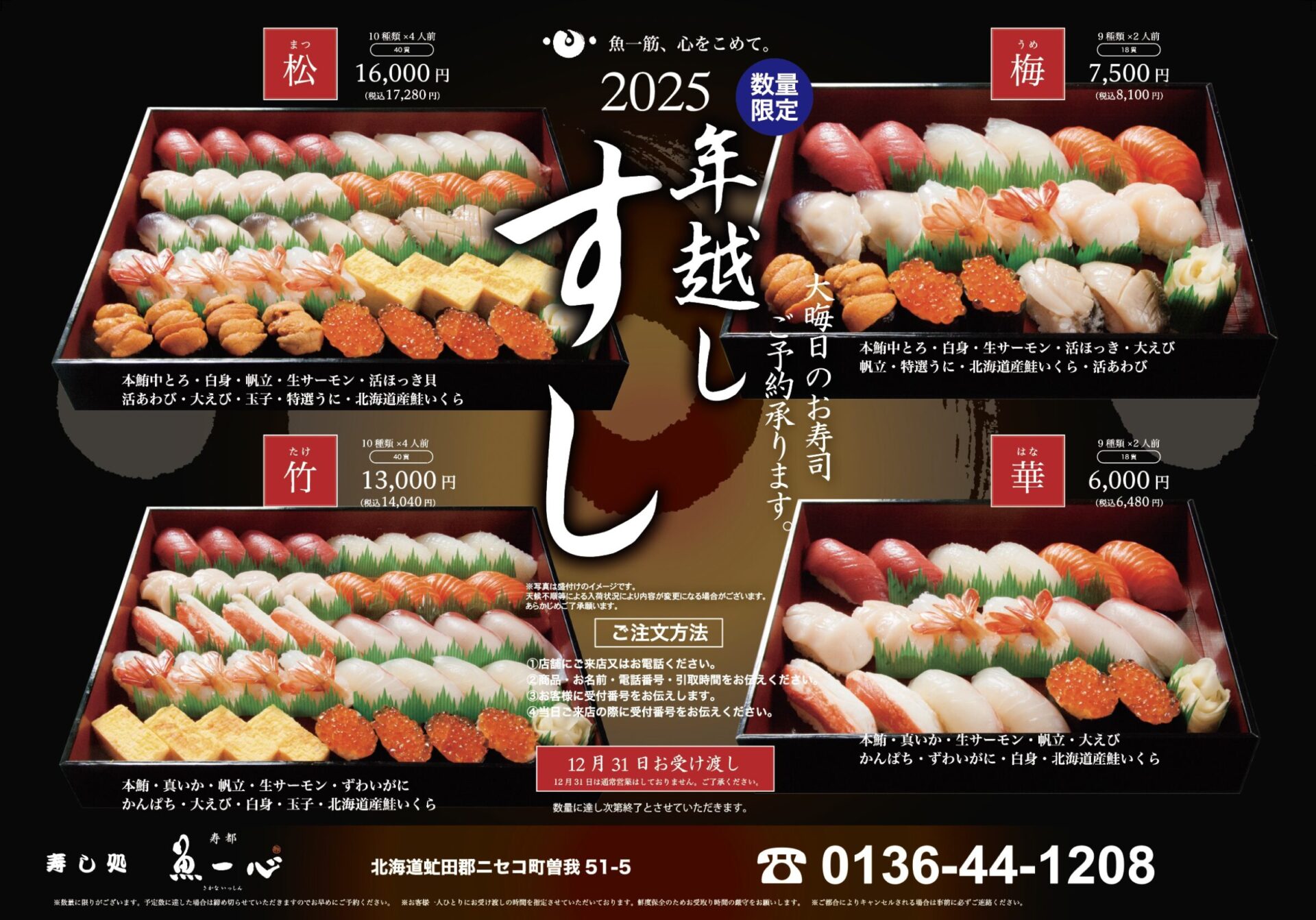 毎年ご好評いただいております年末年越し寿司のご予約受付を開始しております。数に限りがございますのでお早めのご予約をお願いいたします。